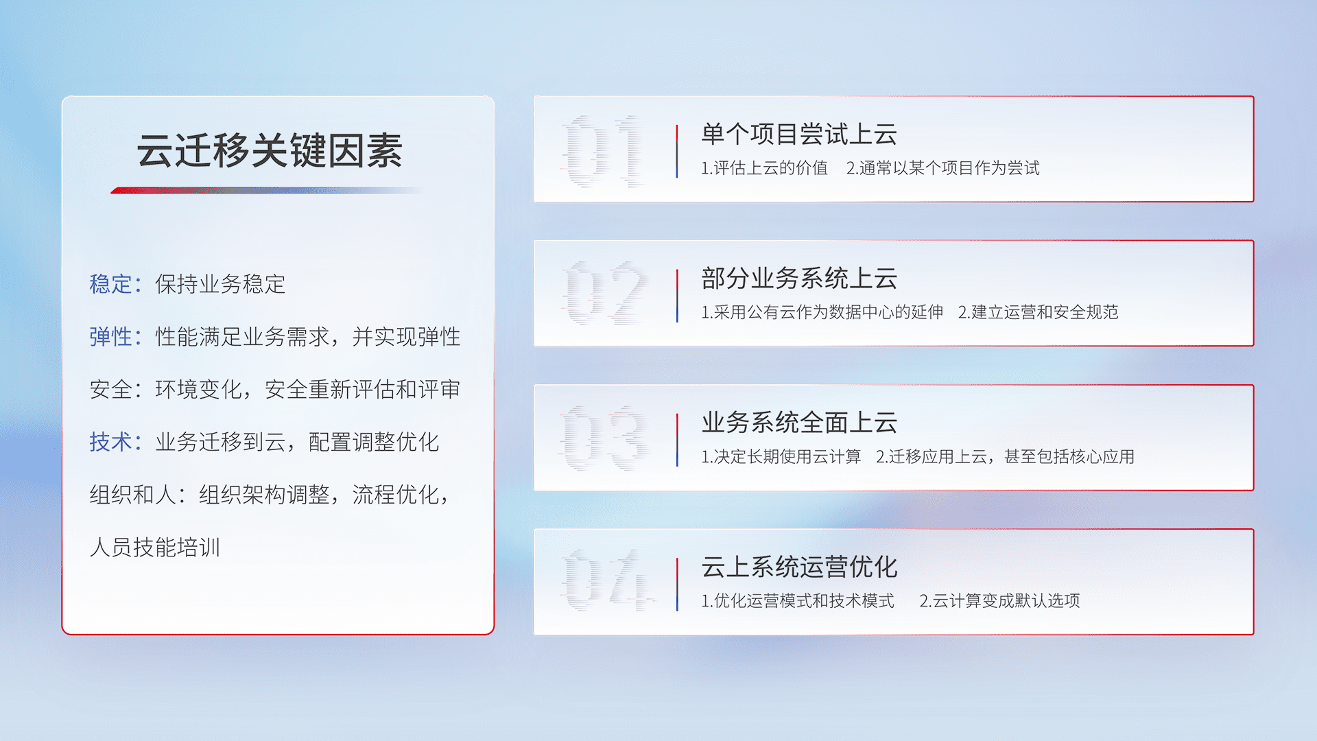 结合实际业务,,从规划设计、、、云平台选型、、云原生改造、、、、数据迁移、、、集成交付,,,迁移全过程为客户识别最佳上云路径,,,,做好风险识别管理,,设计网络架构、、、、身份权限、、安全审计合规、、、、操作审计、、日志审计、、、、监控告警策略、、、、多站点容灾设计等,,对云上基础设施进行整体规划,,,,提升IT治理水平,,,,以满足弹性、、、高可用、、、、高性能的需求。。
